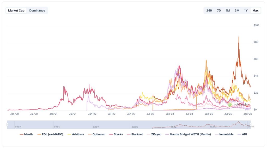 Par ailleurs, la comparaison avec 2020 est souvent citée : l’ampleur des mesures de relance et de création monétaire avait modifié la prise de risque, le BTC servant alors de couverture face à l’injection de liquidités. Ce type de configuration pourrait ne pas se répéter à l’identique aujourd’hui. D’où l’idée que, pour soutenir une reprise durable, Bitcoin pourrait avoir besoin d’un moteur de demande moins dépendant de la macro. À ce jour, il n’y a pas de L2 BTC qui domine le marché.
