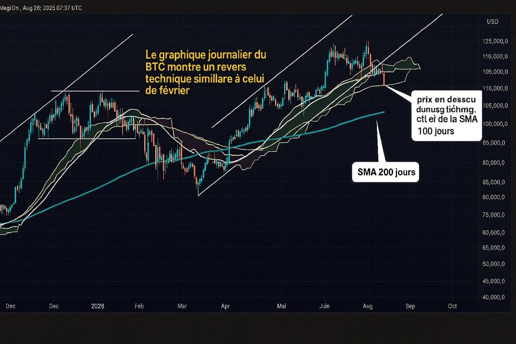 Le Bitcoin (BTC) a décroché sous sa moyenne mobile simple à 100 jours pour la première fois depuis avril. Pour le marché crypto, il s’agit d’un signal technique majeur. La chute, modeste en apparence (-1 % en 24h), a suffi pour briser un support suivi de près par les traders. Le BTC a ainsi touché un point plancher à 109 172 $, confirmant la faiblesse de l’élan.