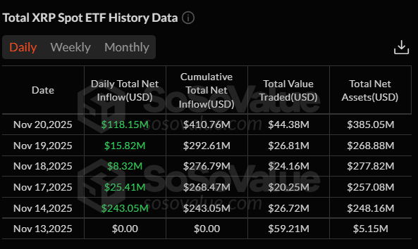 Pendant ce temps, l’ETF XRP de spot de Bitwise est désormais disponible aux États-Unis, ce qui porte les flux quotidiens entrants à plus de 110 millions de dollars. Un montant record qui fait décoller l’AUM portant sur l’écosystème Ripple.