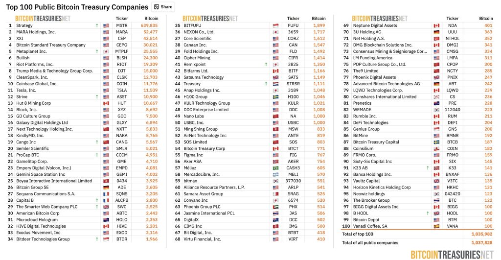 Avec la baisse de ces derniers jours, les achats institutionnels fut plus importants. D’après les données de BitcoinTreasuries, les 100 plus importantes trésoreries bitcoin d’entreprises cumulent à elles-seules plus de 1,03 million de BTC.