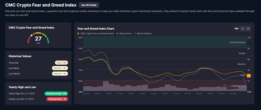 L’indice Fear & Greed, qui mesure le sentiment du marché crypto, est passé de 36 à 27 en 24 heures, soit une baisse brutale. Il était encore à 59 il y a un mois. Cette chute reflète un changement rapide dans le moral des investisseurs.