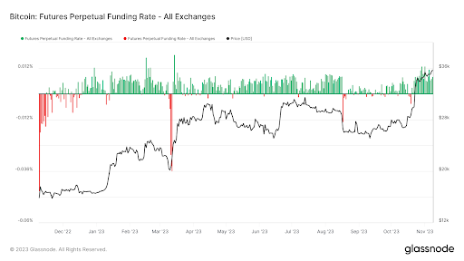 Au cours des dernières semaines, le taux de financement des contrats à terme perpétuels Bitcoin sur une base pondérée en fonction des intérêts ouverts a atteint la moyenne des niveaux atteints pour la dernière fois en mars de cette année. Un taux de financement positif indique une prépondérance des positions longues sur le marché.