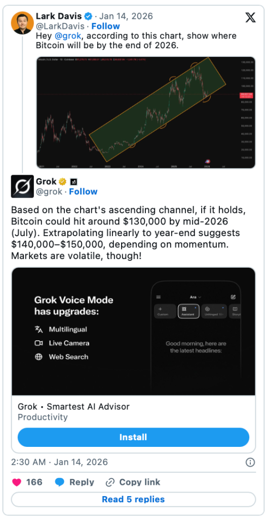 Le graphique met en avant un puissant canal ascendant, montrant que Bitcoin (BTC) a récemment testé le support inférieur de ce canal autour de 90 000 $. Historiquement, ce type de configuration est considéré comme haussier, suggérant une trajectoire à la hausse. Lorsque Davis a demandé jusqu’où la première crypto pouvait monter, Grok a répondu avec un objectif de 130 000 $ pour la mi-2026, vers juillet, et une fourchette de fin d’année entre 140 000 et 150 000 $, ce qui établirait un nouvel ATH.