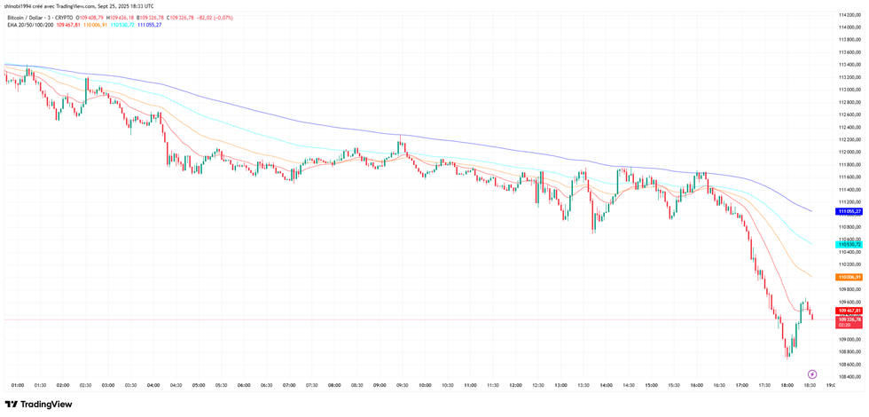 L’impact de cette prise de bénéfice continue de s’observer sur le cours du Bitcoin en cette fin de journée. Le BTC a en effet, cassé la barrière psychologique des 110 000 $ à la baisse. Sous pression depuis le début de la journée, la tendance est clairement baissière. Les prix évoluent sous toutes les moyennes mobiles exponentielles (EMA 20, 50, 100 et 200). Ces courbes descendent et s’écartent les unes des autres. C’est un signe fort de mouvement baissier.