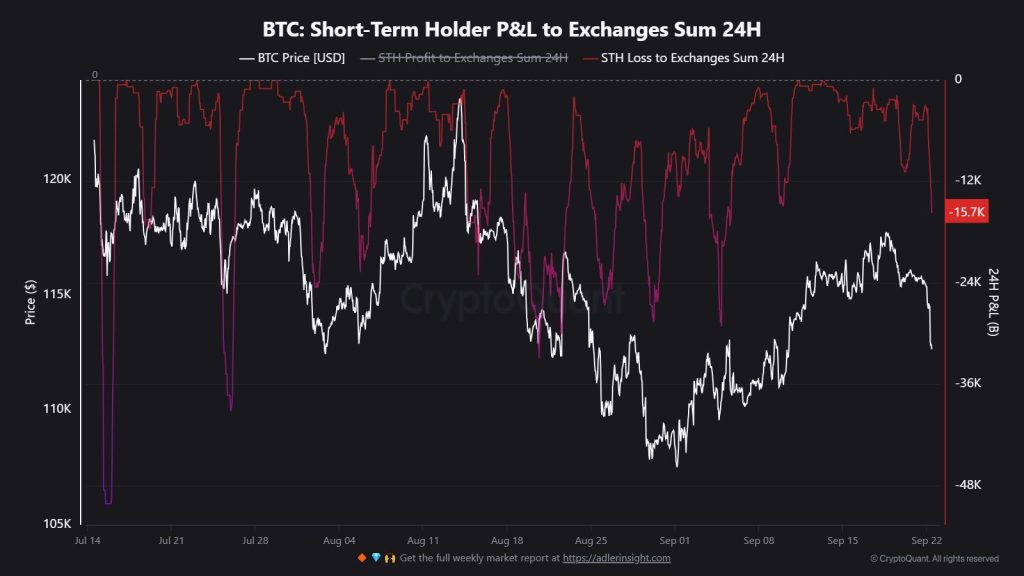 À l’inverse, les short-term holders (STHs) ont agi dans un autre registre. Eux n’ont pas vendu pour engranger des profits, mais par capitulation. On-chain, plus de 15 700 BTC ont été envoyés aux exchanges à perte. Cela représente près de 1,8 milliard $ liquidés dans un contexte de panique.