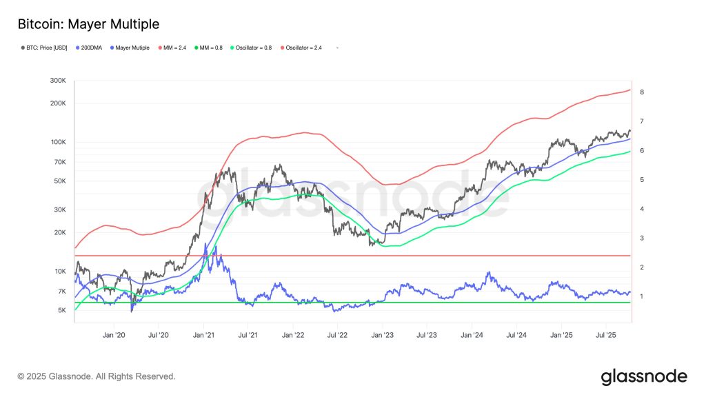 En dépit d’un BTC hésitant encore à 122 000 $, la frénésie n’a toujours pas débuté. Le Mayer Multiple suggère même qu’il reste une large marge de progression avant la surchauffe.