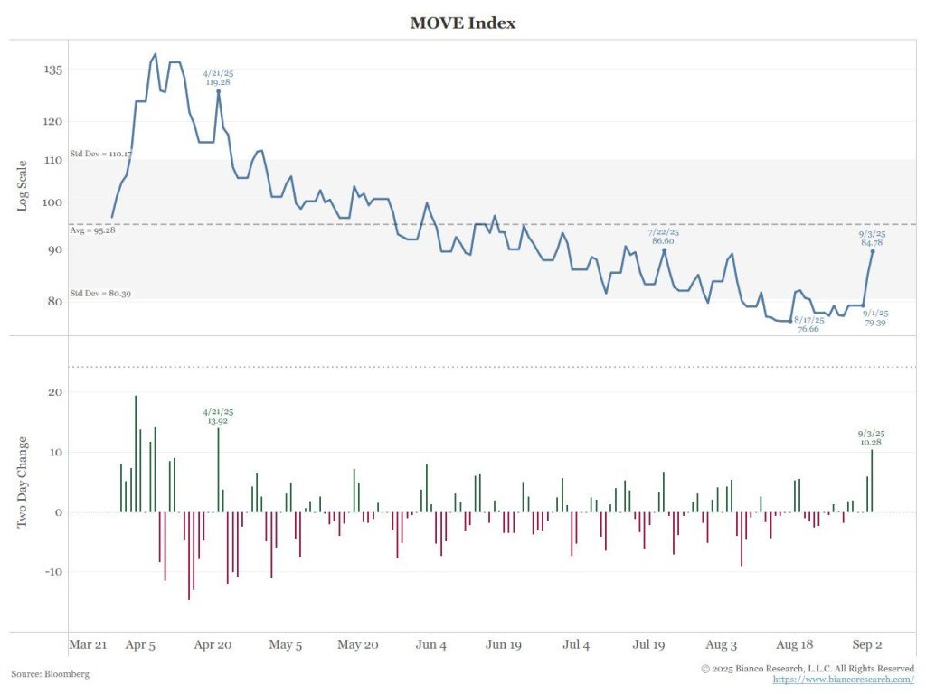 Depuis hier, le Bitcoin semble indiquer quelques signaux de reprise après plusieurs semaines de contre-performance. Mais les oiseaux de mauvaise augure pointent déjà à l’horizon. En l’occurrence, un signal particulier sur le marché obligataire américain inquiète. Le MOVE Index, baromètre de la volatilité obligataire américaine, vient d’enregistrer sa plus forte hausse depuis des mois. Or chaque fois qu’il s’emballe, la liquidité mondiale se contracte entraînant souvent Bitcoin dans sa chute.