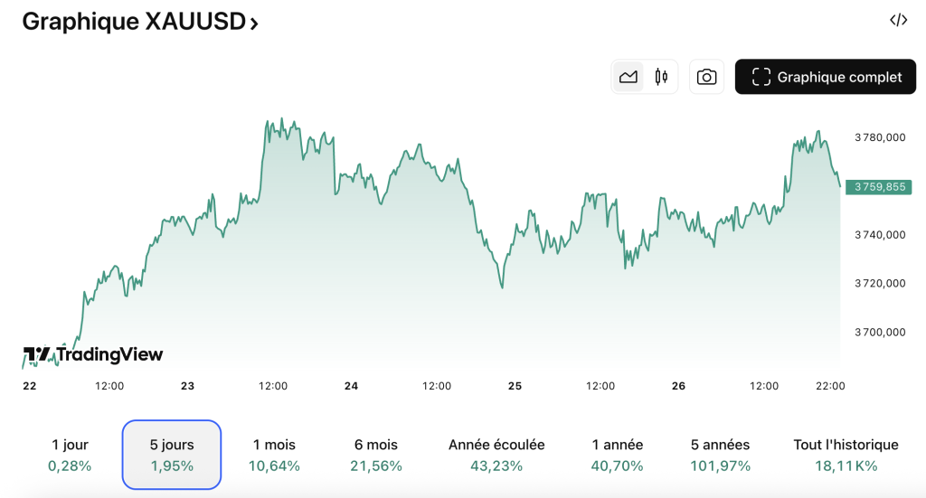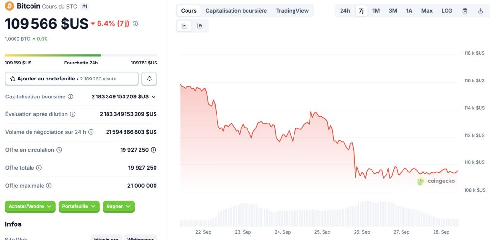 Le bitcoin s’échange actuellement autour de 109 500 dollars, en baisse sur la semaine. L’or reste solide, au-dessus de 3 580 dollars, et le S&P 500 affiche encore un gain trimestriel modéré.