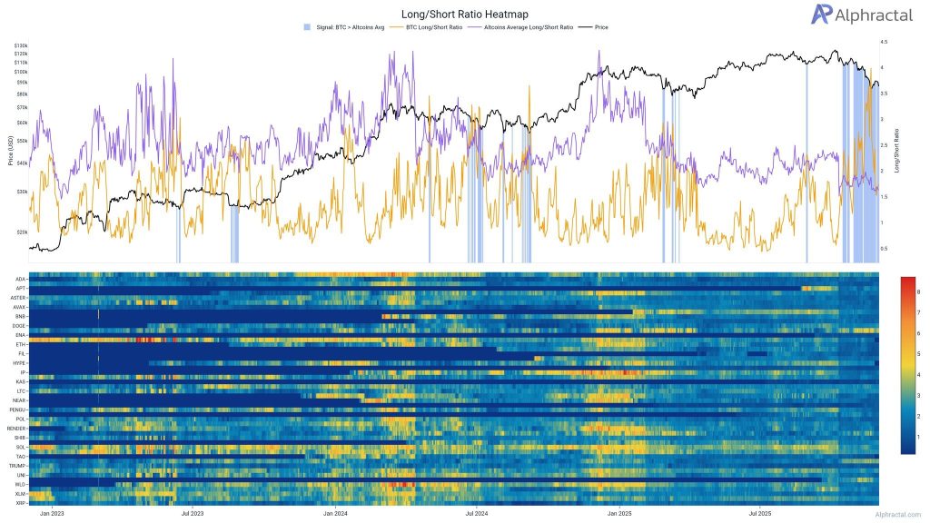 Mais ce cycle n’a rien d’un copier-coller des précédents. D’habitude, lorsque le Bitcoin approche d’un point bas, le long/short ratio remonte au-dessus de celui des altcoins. Historiquement, cela signifie que les traders prennent des positions longues agressives au moment où les creux se forment.