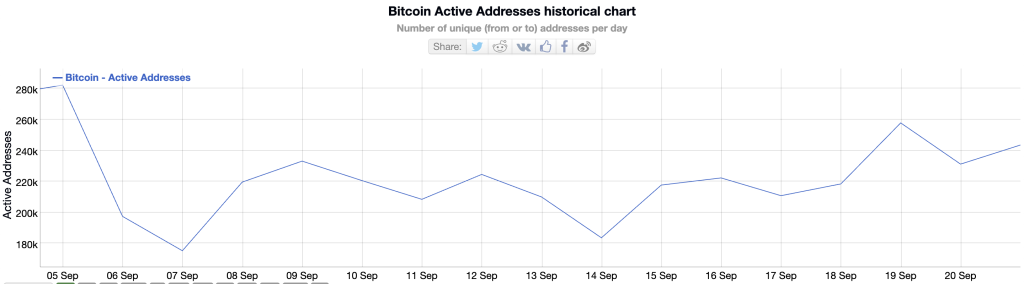 Côté adresses actives, le signal n’est pas linéaire. Sur la première quinzaine de septembre, la courbe oscille largement, avec un creux proche de 180 000 puis un rebond vers 260 000 avant une stabilisation autour de 240 000. Autrement dit, l’activité existe, mais elle reste volatile.