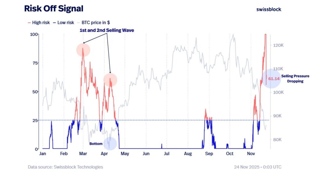 Le rapport publié par Swissblock ce week-end va dans le même sens. L’équipe estime que Bitcoin vient de poser sa première vraie pierre pour construire un bottom. Leur indicateur maison, le Risk-Off Signal, chute rapidement traduisant deux éléments importants :