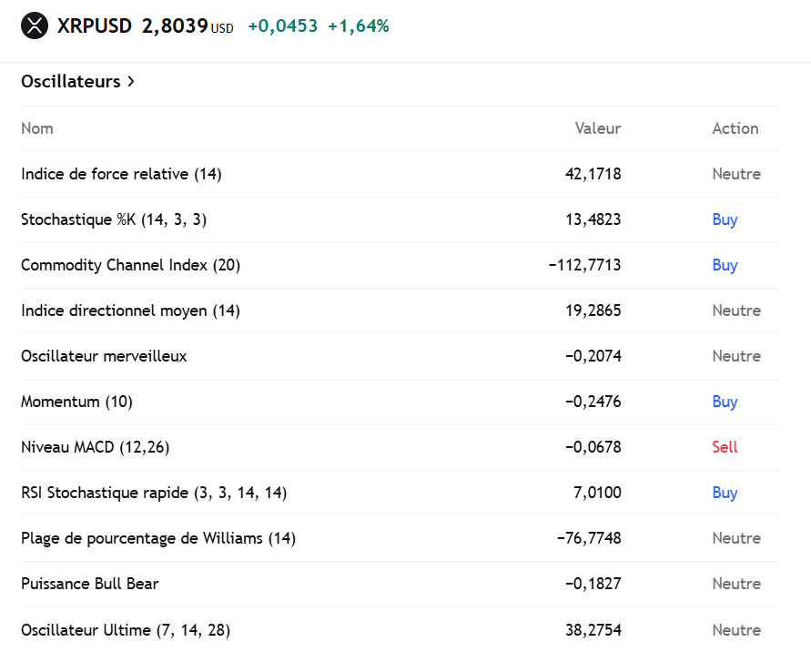 En revanche, le MACD commence à converger vers un croisement haussier. L’indice de force relative (RSI), situé autour de 41,6704 reste neutre mais prêt à basculer si l’élan se confirme.