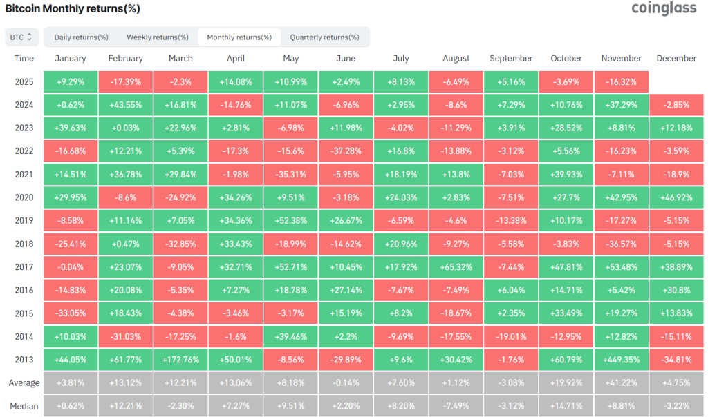 C’est peut-être l’élément le plus déroutant : novembre est historiquement le meilleur mois du Bitcoin, avec une performance moyenne de +41 % selon les données de CoinGlass.