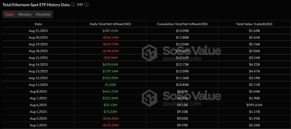 Après quatre jours consécutifs de sorties massives, les ETF Ethereum au comptant viennent d’enregistrer un spectaculaire retournement. La journée du jeudi s’est ainsi achevée sur un afflux de 287,6 millions $ de capitaux nets. Un stop net à une série de retraits qui dépassait 924 millions $ depuis le 15 août. Au cœur de ce rebond, un acteur domine : BlackRock. Son iShares Ethereum Trust (ETHA) capte l’écrasante majorité du flux et pose déjà un nouveau drapeau de ralliement.