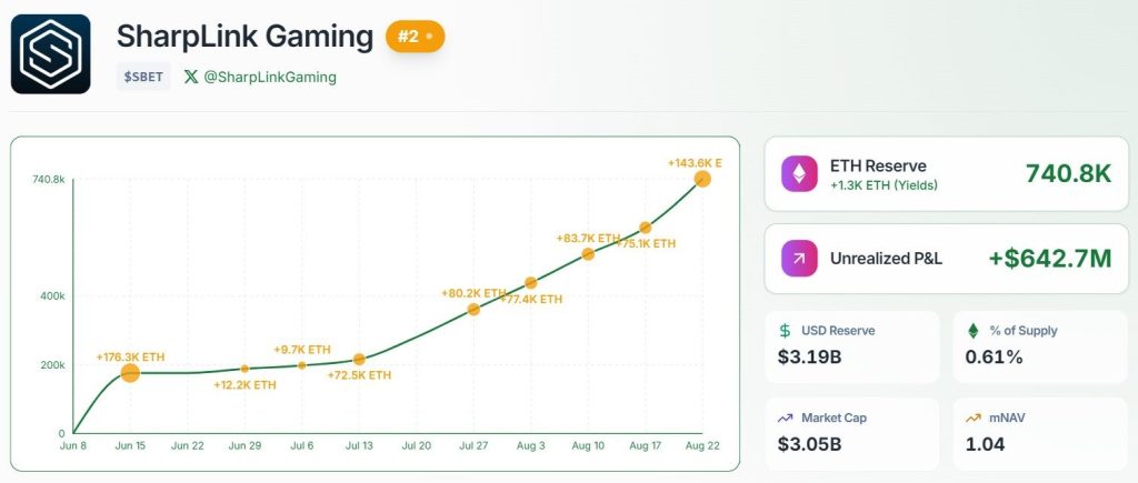 Et dans cette course à l’accumulation, certains acteurs s’illustrent de manière exceptionnelle. SharpLink Gaming a acheté pour 667 millions $ d’ETH en début de semaine, portant ses avoirs à 740 000 ETH (3,2 milliards $). Cela en fait aujourd’hui le deuxième détenteur corporate d’Ether, derrière Bitmine Immersion Tech et ses 1,5 million d’ETH.