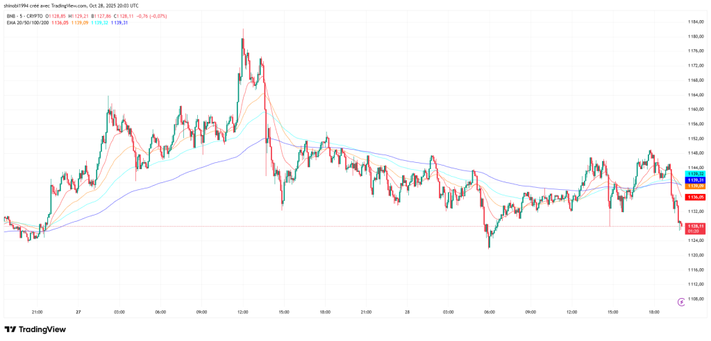 Sur la dernière journée, près de 100 000 BNB ont changé de mains en une heure, preuve d’une activité soutenue. Mais cette poussée de volume n’a pas permis de franchir la résistance des 1 147 $. Le signal technique reste donc neutre. Les investisseurs attendent désormais un catalyseur plus fort pour reprendre confiance.