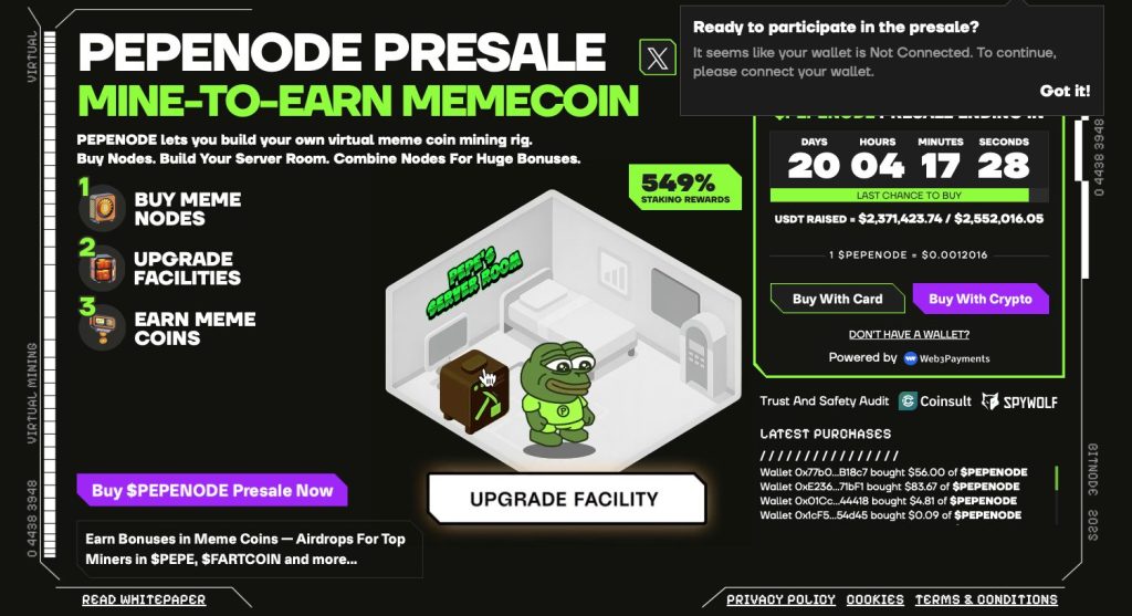 En parallèle des secousses macro, certains investisseurs se tournent vers des projets plus « GameFi » comme PepeNode ($PEPENODE), une plateforme de mining virtuel sur Ethereum où l’on achète et améliore des « nodes » pour simuler la production de récompenses.