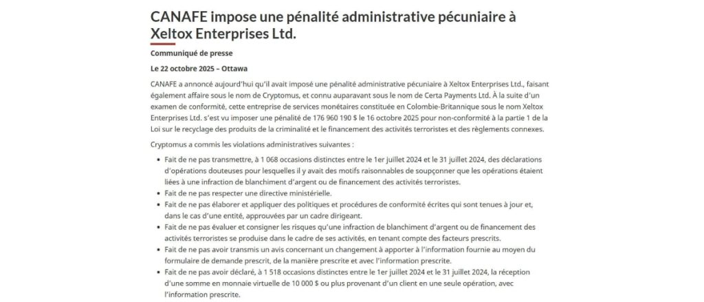 Le Canada envoie un signal inédit au secteur. Le régulateur FINTRAC a infligé une amende record de 177 millions de dollars à Xeltox Enterprises Ltd. (Cryptomus) pour manquements graves aux obligations anti-blanchiment. L’affaire marque un tournant pour la conformité des plateformes, avec un message simple : zéro complaisance.