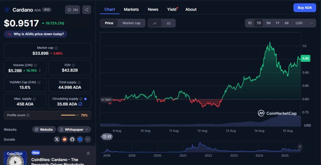 Alors que la plupart des cryptos marquent une pause, Cardano (ADA) joue les trouble-fête. En 24 heures, son prix a grimpé de 10,45 %, avant de redescendre un peu, jouant avec la barre symbolique des 1 $, pendant que le reste du marché subissait une petite correction. Mais pourquoi ADA grimpe-t-il pendant que le marché corrige ?