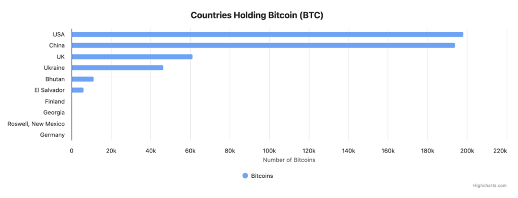 La détention de bitcoins par les gouvernements représente un autre axe de croissance. Selon les données de Bitbo, les États-Unis détiennent actuellement 198 012 BTC. Ils sont suivis par la Chine qui possède 194 000 BTC et par le Royaume-Uni avec 61 245 BTC.