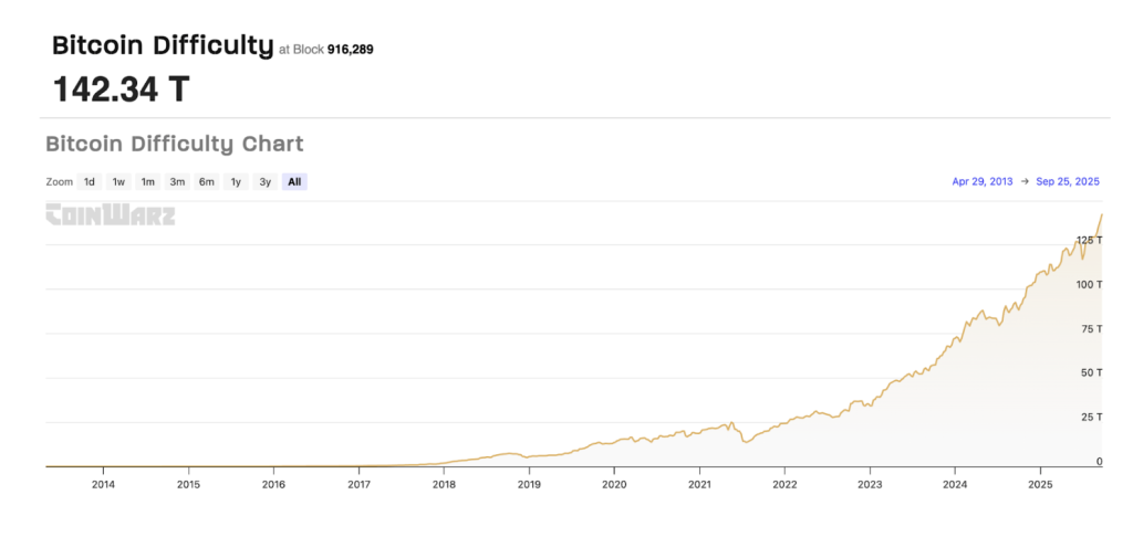 Jeudi 25 septembre 2025, la difficulté de minage liée au Bitcoin a atteint 142,34 T. Ce chiffre brut représente le seuil cible que les mineurs doivent atteindre avec leurs hashs.
