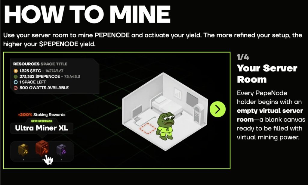 Dans le même temps, le nouveau projet de mème coin PepeNode (PEPENODE) propose une solution alternative. Il permet de faire du minage une expérience virtuelle gamifiée plutôt qu’en une course effrénée entre des machines qui génèrent d’énormes factures d’électricité.