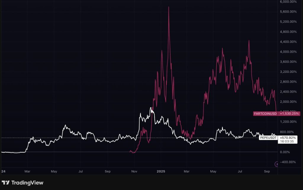 Mais attention, cela ne veut pas dire que les mème coins n’offrent pas d’énormes opportunités. Des jetons comme le PEPE et le FARTCOIN l’ont déjà prouvé. Même si le PEPE a atteint son sommet il y a 10 mois, les premiers détenteurs profitent encore de gains à plus de 17 000 % par rapport aux prix d’entrée qui étaient proposés il y a deux ans.