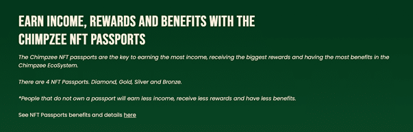 Vous pouvez également investir dans les Passeports NFT de Chimpzee. Ils apportent une large gamme d’avantages à l’écosystème de Chimpzee. En plus de gagner des privilèges sur la plateforme et des récompenses supplémentaires, vous pouvez miser les passeports NFT pour des APY attrayants.