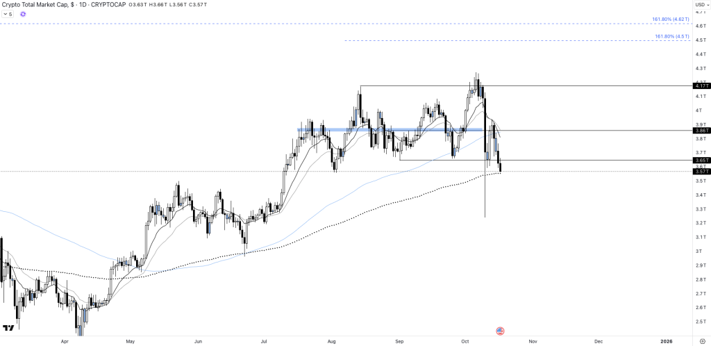 Est-ce réellement la fin du bullrun crypto, ou du moins, ce qu’il en restait avec quelques hausses isolées d’altcoins (HYPE, ASTER, BNB…) ? La capitalisation totale du marché crypto passe dangereusement sous les 3 650 milliards de dollars, ce qui ouvre les portes d’une nouvelle jambe baissière en direction des 3 000 milliards de dollars.