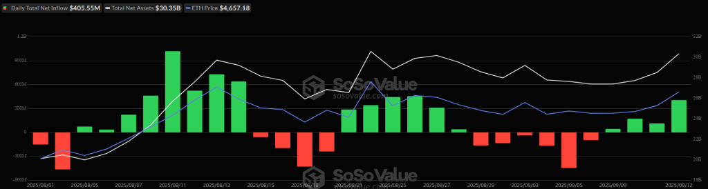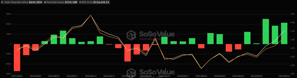 Malgré la baisse des prix, les flux entrants dans les ETF Bitcoin et Ethereum restent robustes. Le 12 septembre, les ETF BTC ont enregistré 642 M$ d’entrées nettes, portant le total cumulé à 56,8 Md$.
