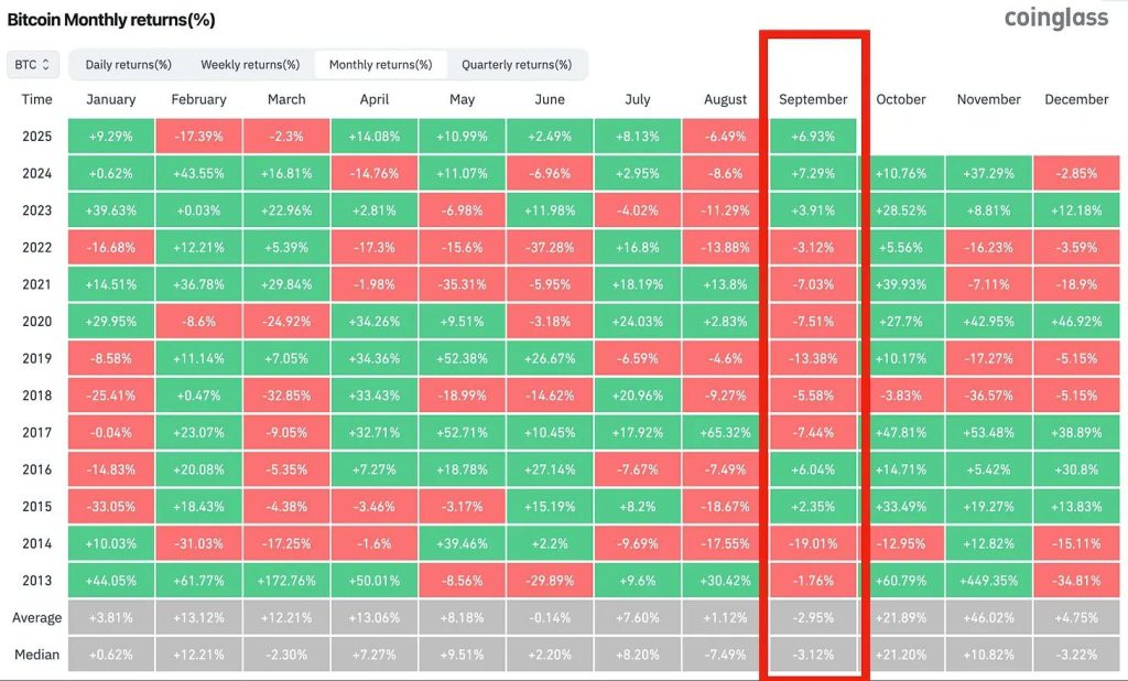 D’un point de vue historique, septembre est rarement favorable au Bitcoin. La performance moyenne du mois est de -2,9 %, sous l’effet d’une pression vendeuse récurrente. Dawson rappelle toutefois que le quatrième trimestre pourrait relancer fortement la dynamique.