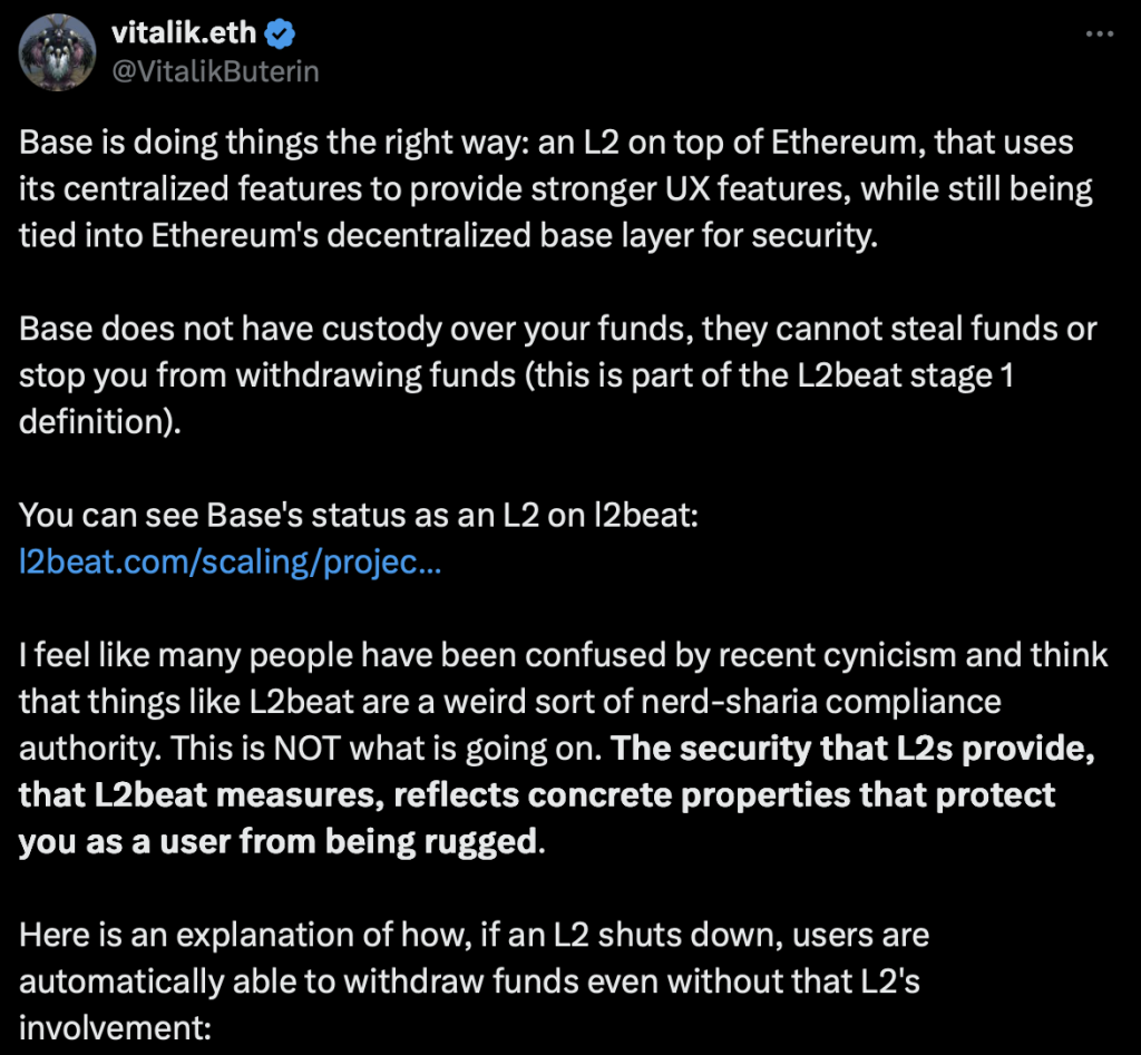 Quoi qu’il en soit, le soutien de Vitalik n’est pas anodin. Disposant d’une vision complète de l’écosystème et ayant récemment appuyé les besoins prioritaires d’ethereum, affirmer que Base fait les choses correctement démontre que Coinbase dispose de toutes les compétences techniques pour consolider sa croissance dans les années à venir et continuer tel que l’équipe officielle le fait actuellement.