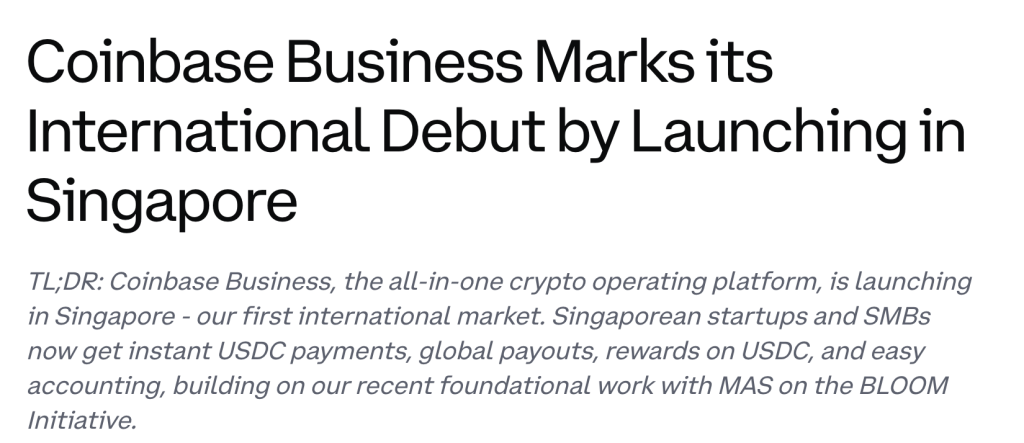 Coinbase Business débarque à Singapour : SME, paiements USDC et transferts SGD en temps réel