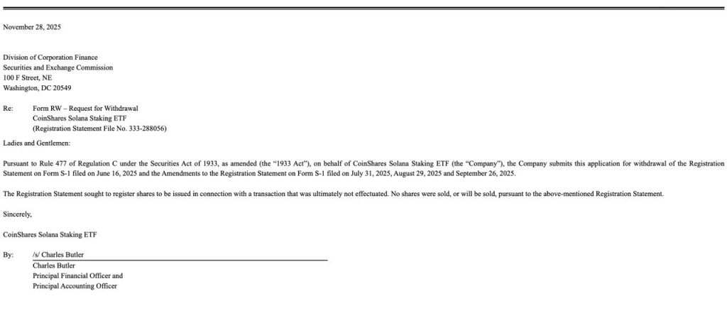CoinShares a officiellement demandé à la SEC de retirer ses prospectus pour trois ETF adossés à XRP, Solana et Litecoin. Le projet est stoppé en amont, sans émission de parts ni commercialisation auprès du public.