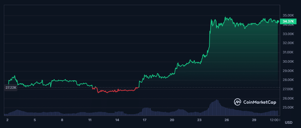 Lors du récent rallye du marché crypto, la semaine dernière, le Bitcoin a pris une avance significative sur tous les altcoins. Il a atteint un pic de 35 300 $ et a, par la même occasion, surclassé Ethereum avec une progression mensuelle de 30 % contre 8 % pour l’ETH.