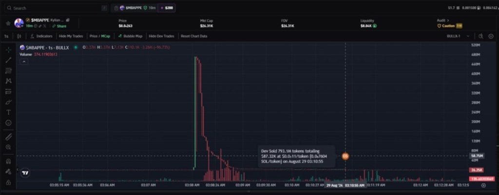 Malheureusement, des millionnaires se sont également fait avoir par la manœuvre. Un wallet aurait acheté pour 1 million de dollar (7156 SOL) du jeton MBAPPE. Le million s’est transformé en seulement 9 000 dollars en quelques minutes.