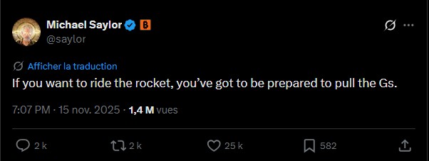 Il répète que « la volatilité est une taxe qu’on paie pour accéder à un actif supérieur ». Les corrections éliminent les mains faibles, assainissent le marché et renforcent l’offre illiquide. Pour Saylor, Bitcoin suit son chemin normal : adoption mondiale croissante, cycles plus larges, institutions qui achètent en période de faiblesse. Rien de dramatique, juste un marché qui se professionnalise.