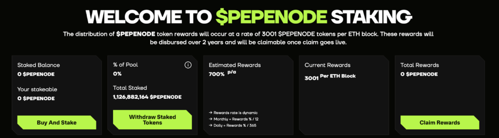 D’autre part, il faut noter que le rôle de ce jeton dépasse le simple cadre du jeu. Les détenteurs peuvent en effet aussi staker leurs PEPENODE via le protocole de staking natif du projet. Celui-ci offre actuellement un rendement dynamique de 700 %.