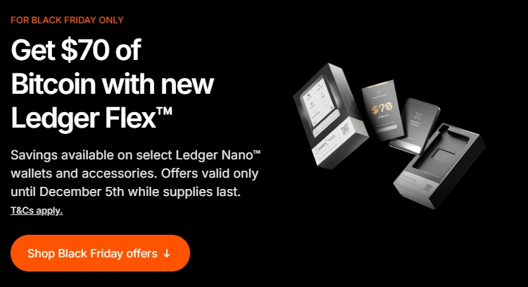 Il vous suffit de suivre ce simple guide pour acheter les appareils Ledger qui sont éligibles au Black Friday et transformer votre bon d’achat de 70 $ en Bitcoin pour le Ledger Flex.