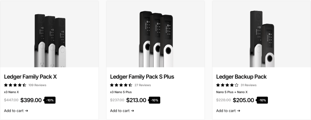 Les utilisateurs souhaitant acheter plusieurs portefeuilles Ledger peuvent bénéficier d’une réduction de 10 % grâce aux offres groupées de Ledger le Family Pack et le Backup Pack :