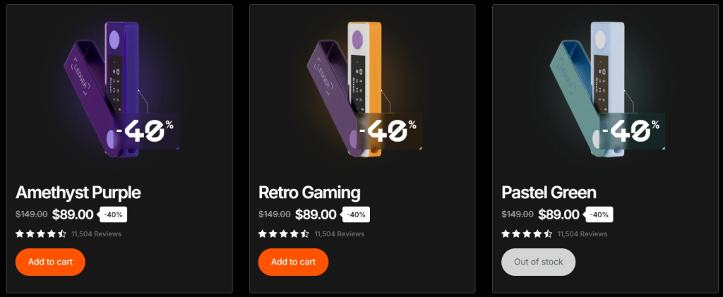 Les offres Ledger Nano S Plus et Nano X sont disponibles dans plusieurs coloris exclusifs. La remise la plus élevée de 40 % est offerte sur les deux appareils en vert pastel, violet améthyste et couleurs rétro gaming. Notons que l’édition noir mat du Ledger Nano S Plus est disponible avec une réduction de 25 %.