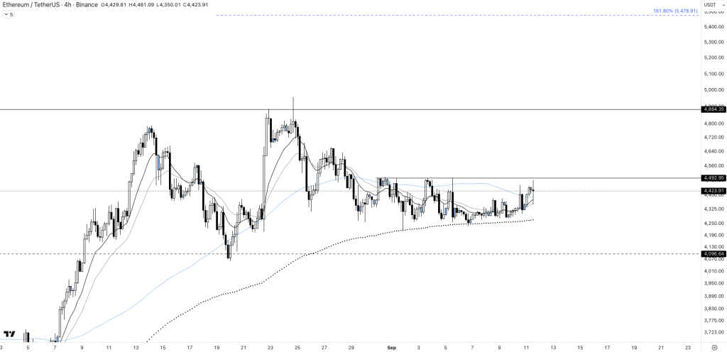 Pendant ce temps, la seconde crypto du marché tente une cassure de sa résistance H4 à 4 492 dollars. Confiné sous cette zone depuis la fin du mois d’août, c’est la première fois qu’ethereum parvient à franchir durablement sa MA100. Les prochaines heures seront décisives.