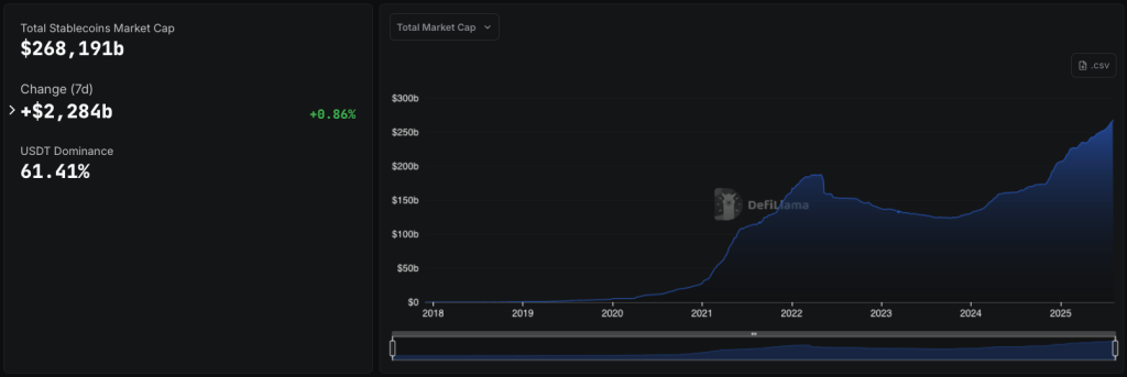 La capitalisation totale des stablecoins s’approche actuellement des 270 milliards de dollars. L’USDT domine le marché à hauteur de 61 %, suivi par l’USDC en seconde position et l’USDe (Ethena) dans le top 3.