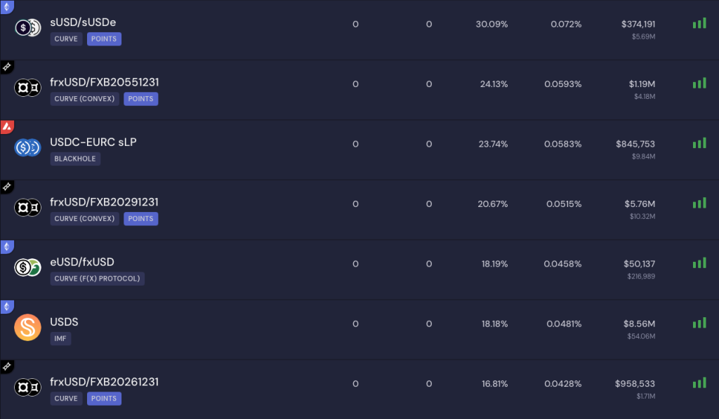 Effectivement, en se penchant sur les rendements proposés par Beefy, des projets plutôt reconnus dans l’écosystème, comme Curve ou Balancer, proposent des APY plutôt élevés sur des stablecoins comme l’USDC ou EURC, ou du sUSD.