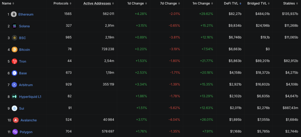 Après une perte de popularité, ethereum retrouve près de 60 % de la TVL globale qui est présente dans la DeFi, affichant à elle-seul plus de 82 milliards de dollars. Par ailleurs, c’est la blockchain du top 10 qui affiche la meilleure hausse sur les trente derniers jours.