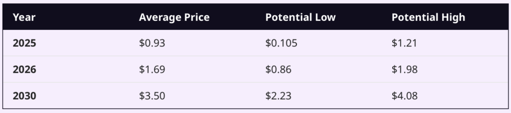 Pour un jeton actuellement vendu à 0,1073 dollar, cette prévision indique déjà un gain potentiel de 766 %. Cela correspond à un retour sur investissement de x8,67 pour les premiers investisseurs selon l’estimation basse.