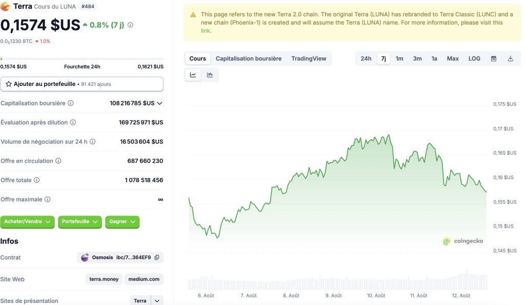 À l’approche du procès, le cours de LUNA 2.0 ne s’enflamme pas : ce lundi matin, il se négocie autour de 0,68 $, en baisse de près de 12% sur une semaine. Les volumes de transaction restent modestes, signe que les investisseurs restent prudents.