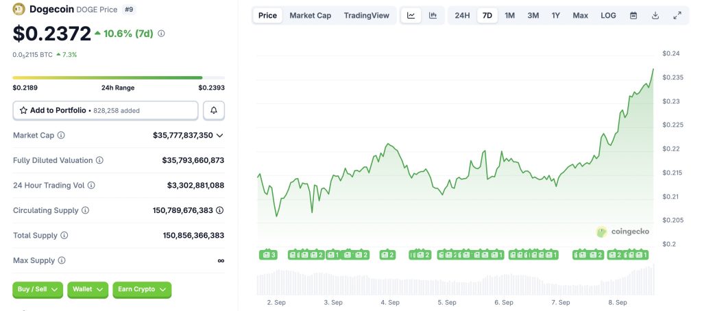 En une seule journée, Dogecoin a gagné quasiment 11 %, franchissant la barre des 0,237 $. Cette hausse survient dans un marché globalement haussier, mais l’actif se démarque nettement des autres altcoins.
