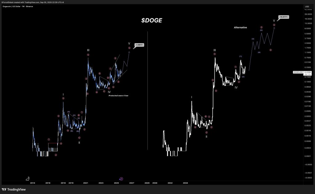 Certains analystes vont même plus loin. Pour XForceGlobal par exemple, DOGE pourrait viser un nouvel ATH à 1 $ dans ce cycle. Il poursuit même sur un scénario extrême à 10 $ avec une extension des vagues d’Elliott. Il suffit simplement que la vague d’achat soit au rendez-vous au lancement de l’ETF.