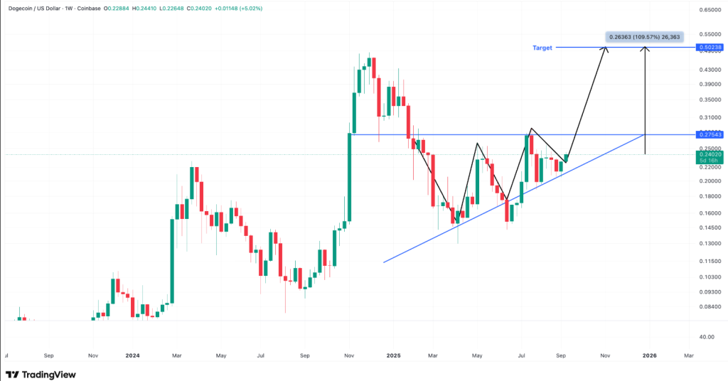 L’analyse technique donne des objectifs ambitieux. Sur le graphique hebdomadaire, DOGE évolue dans un triangle ascendant. La résistance clé se situe à 0,27 $. Une clôture au-dessus ouvrirait la voie vers 0,50 $, soit un gain potentiel de 110 % par rapport aux niveaux actuels.